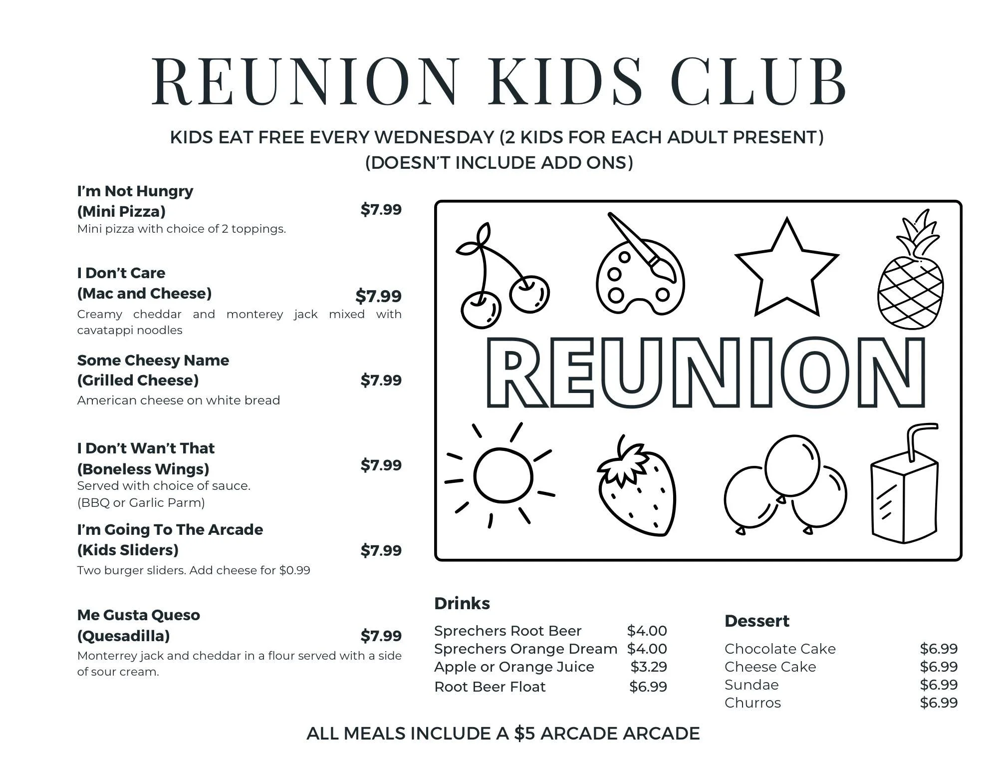 For parents, it's a midweek break from cooking where you can enjoy chef-crafted meals and a night off, knowing the kids are having a blast and eating for free. With the Reunion Kids Club, Wednesday nights just became a weekly highlight for everyone in the family.